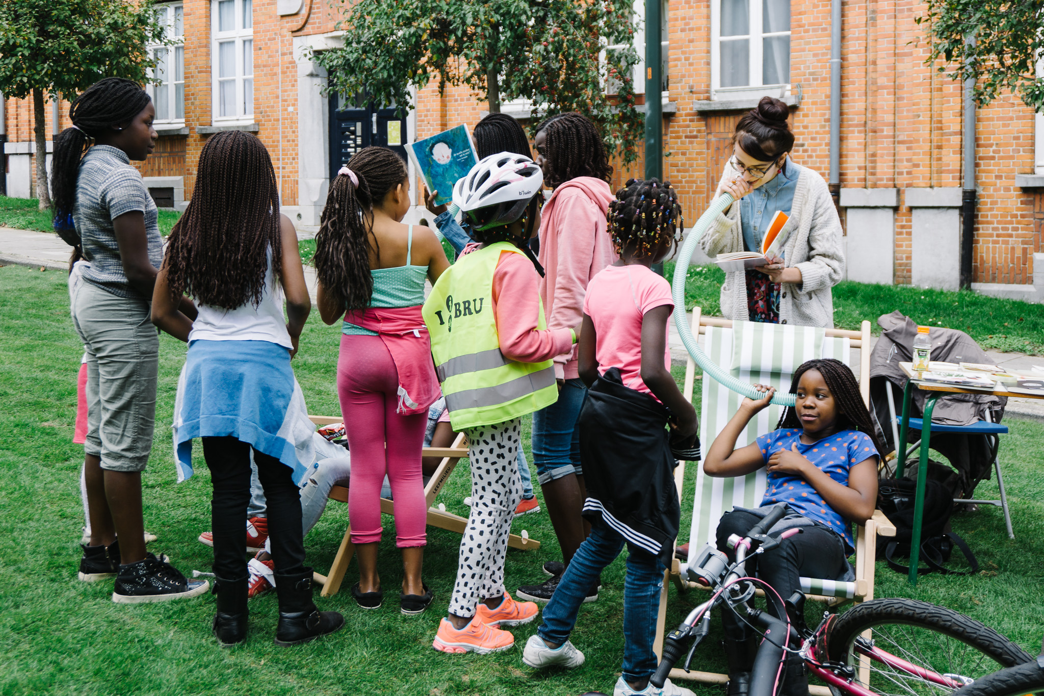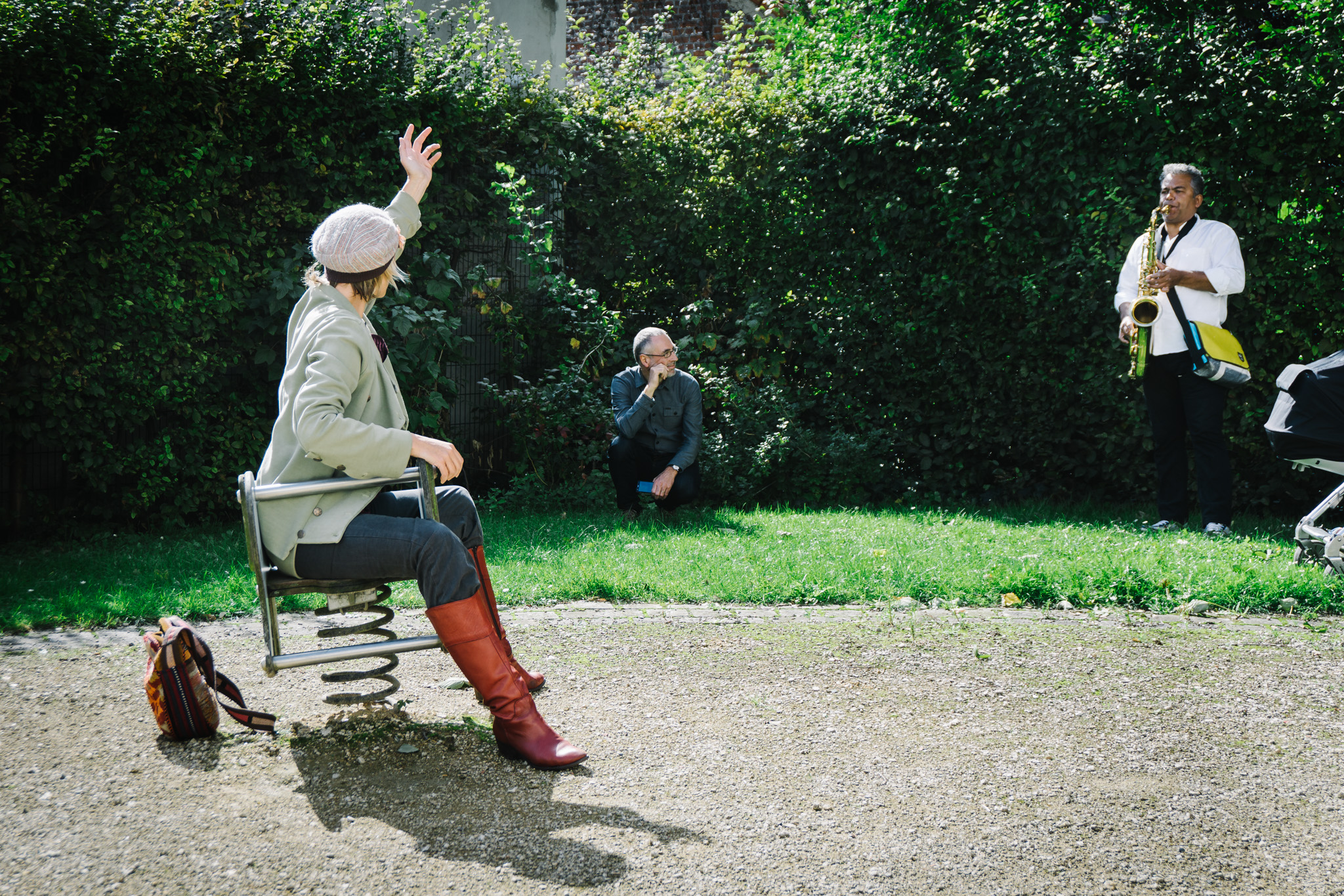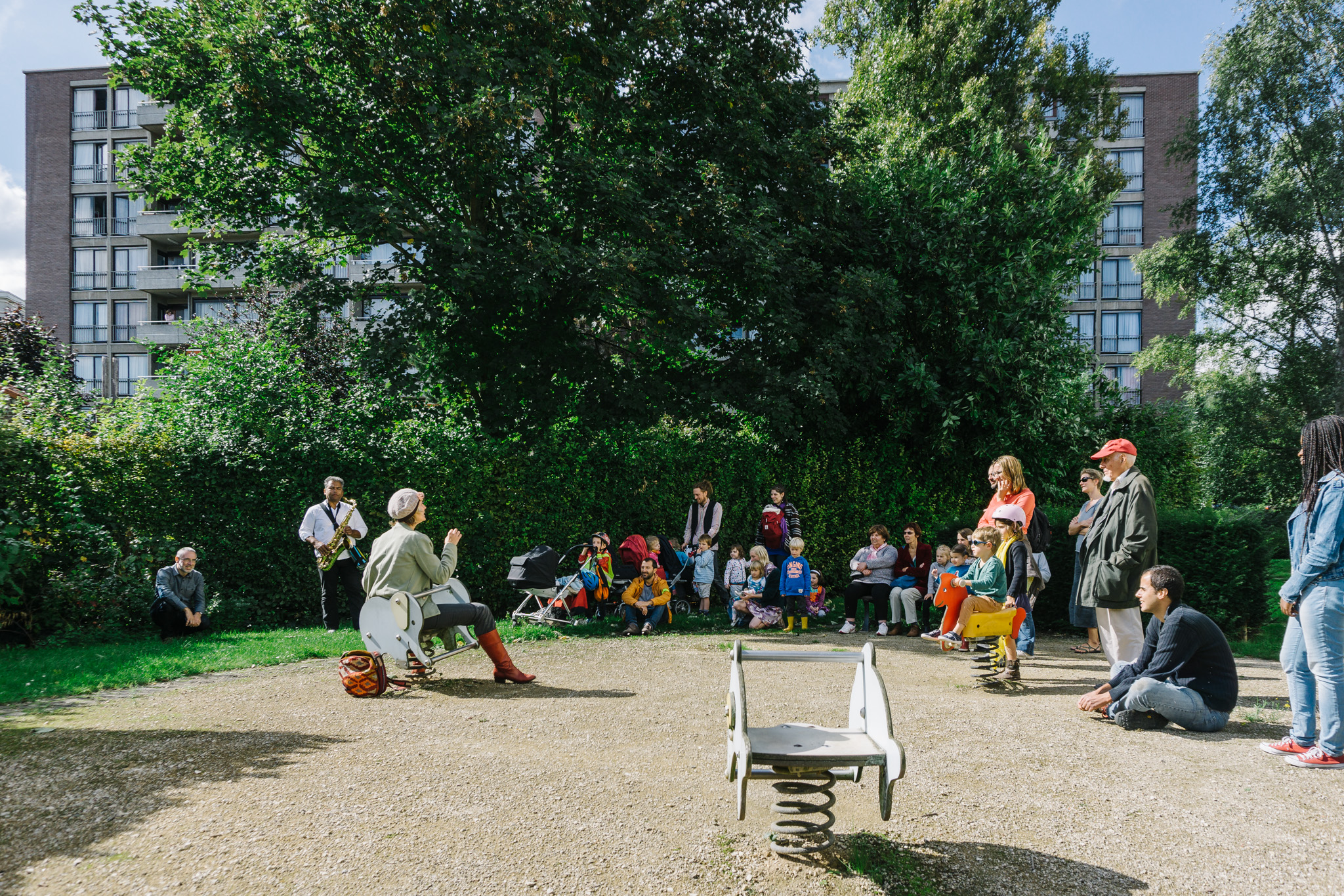 « Des histoires en marchant. Des histoires entre deux marches. Des histoires africaines racontées avec l’accent moitié bruxellois moitié wallon par une artiste belgo-flamande aux origines incertaines, accompagnée d’un musicien français né à Madagascar. On se promène. On marche avec les mots qu’on vient d’entendre. On se pose avec des questions. »