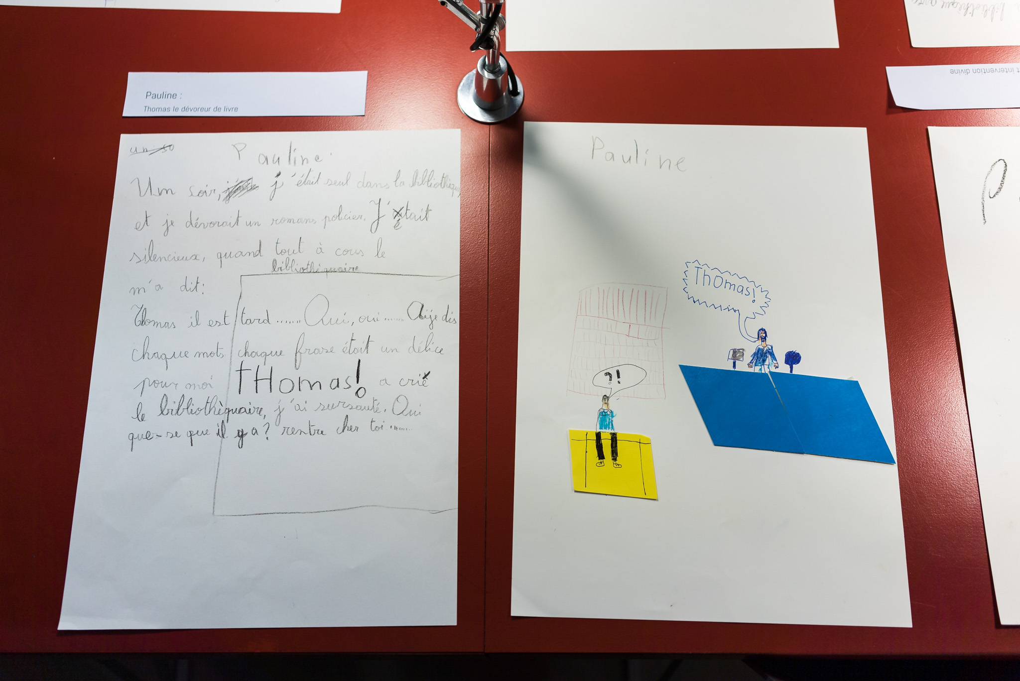 « Au départ de lecture d’albums tels que : C’est un livre de Lane Smith, Travailler moins pour lire plus d’Alain Serres ou Un bateau livre de Nicolas Thers, je propose un brainstorming : La bibliothèque c’est… Dans la bibliothèque il y a… Ensuite, à l’aide de papiers découpés, de techniques de dessin, nous produirons des images. »