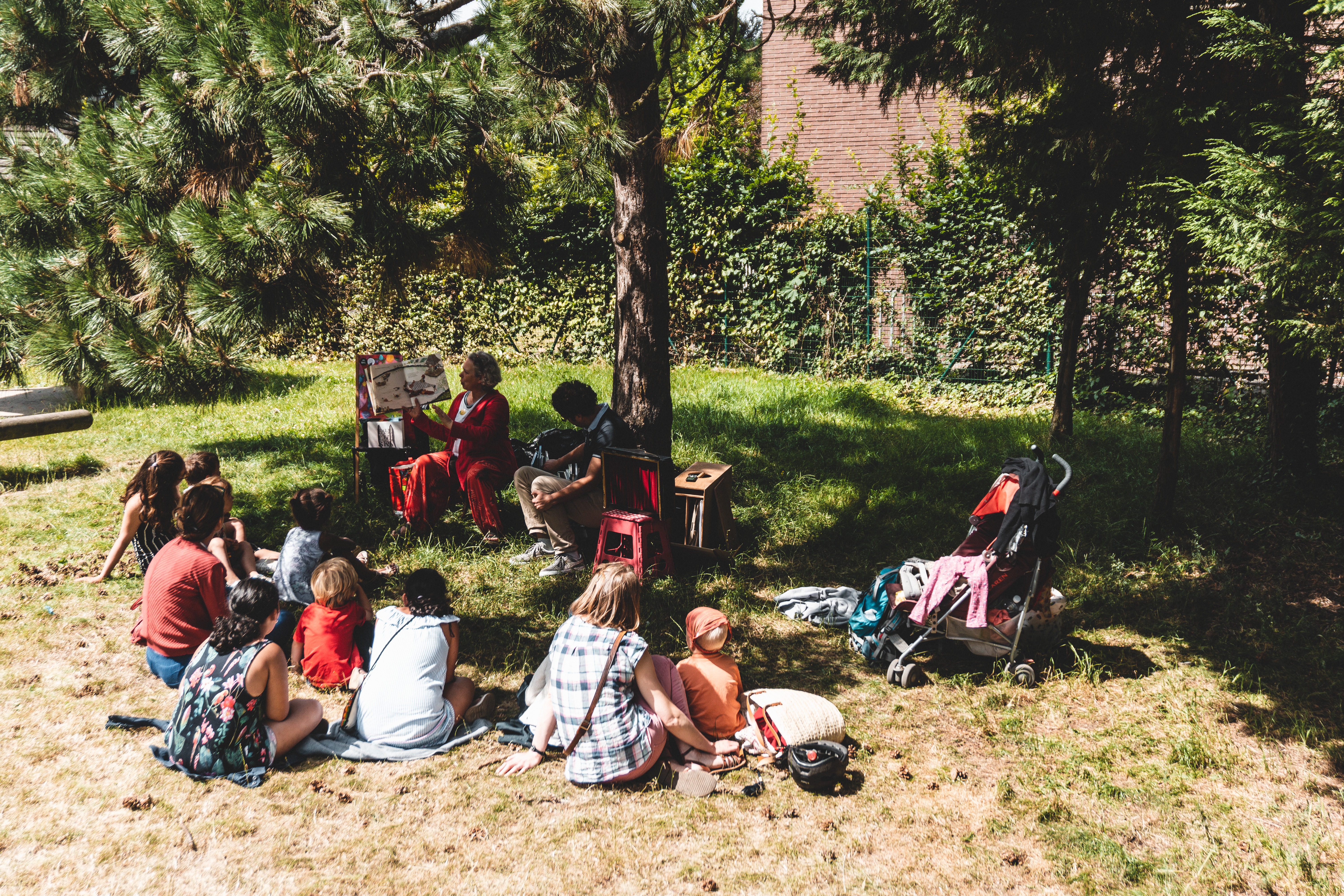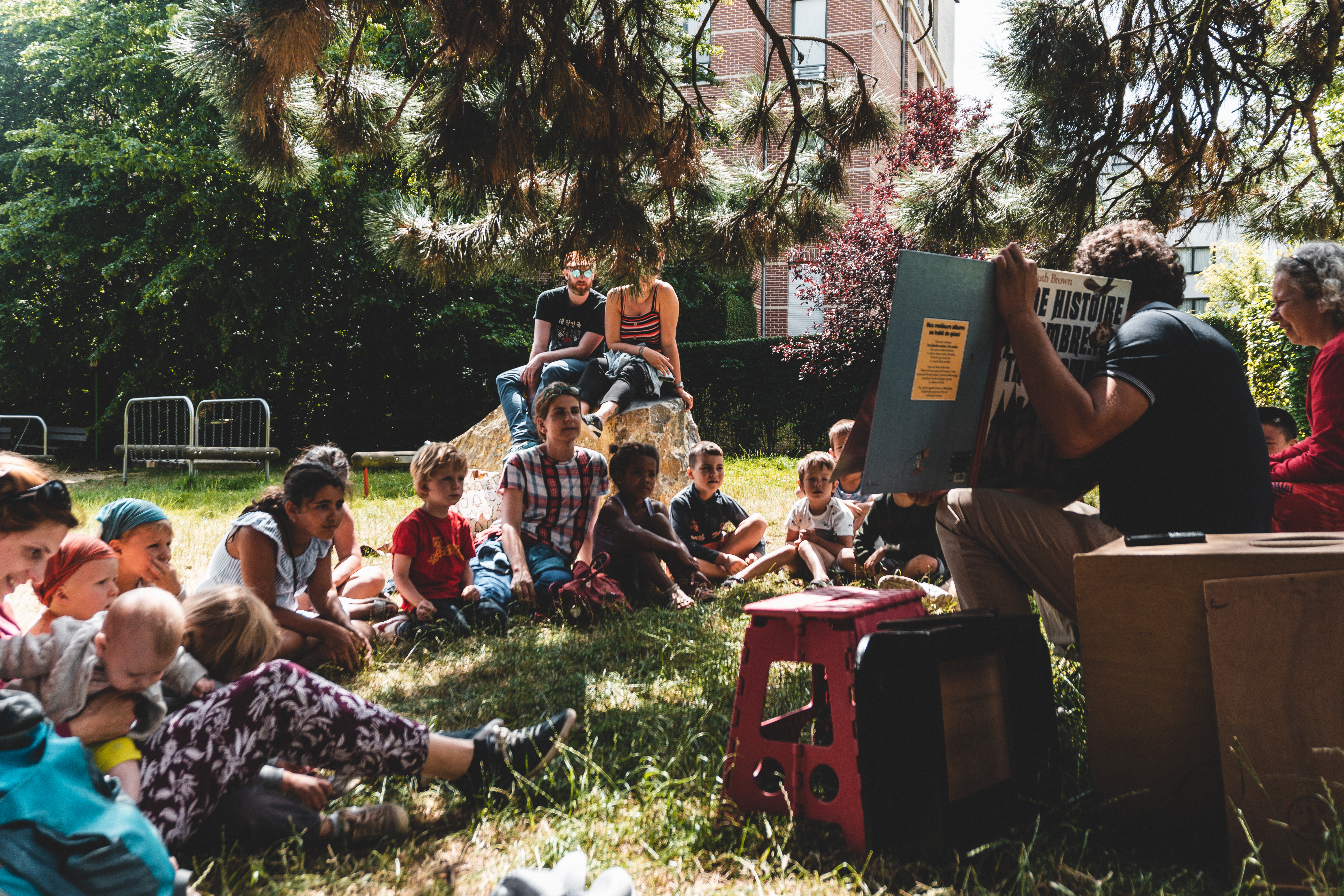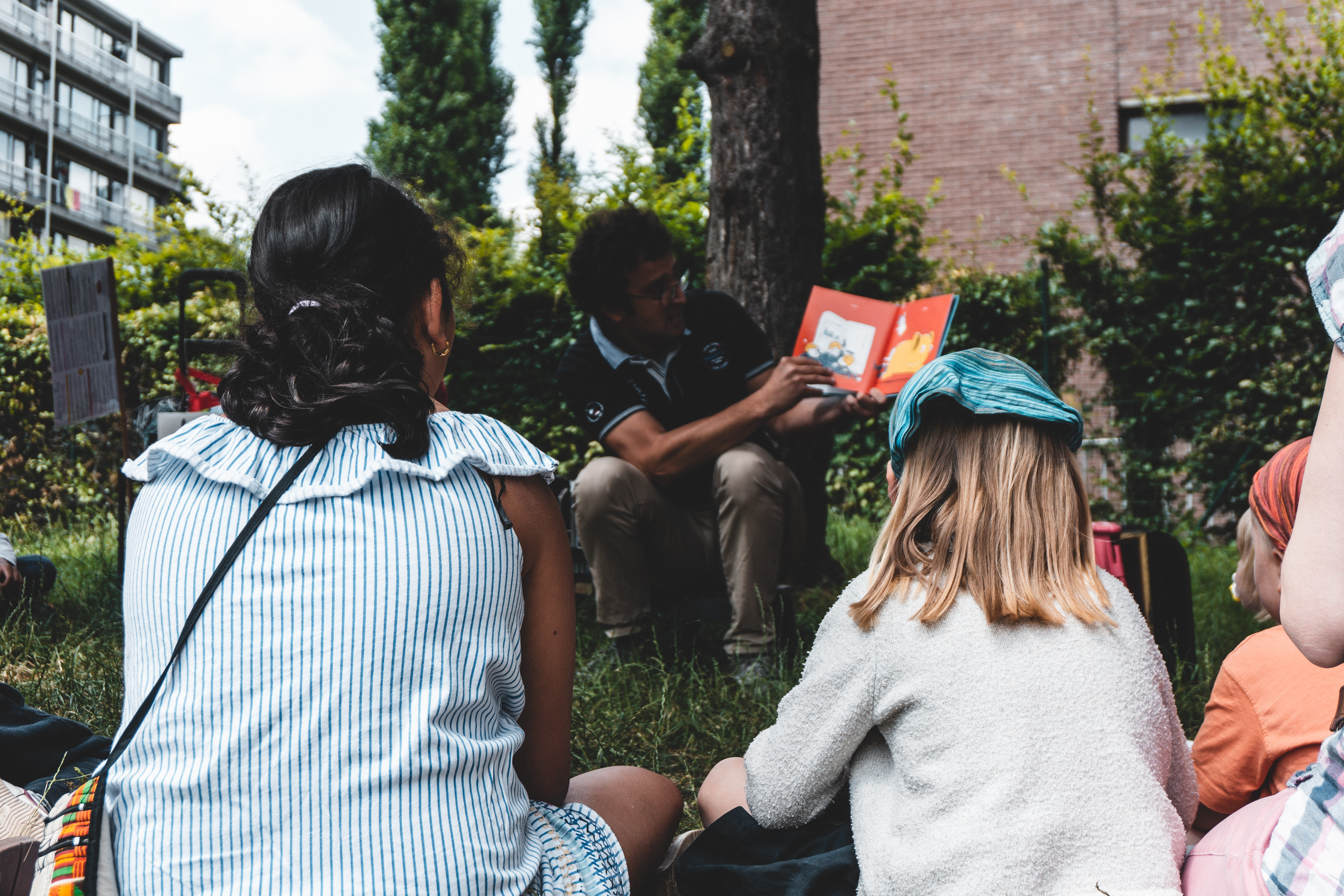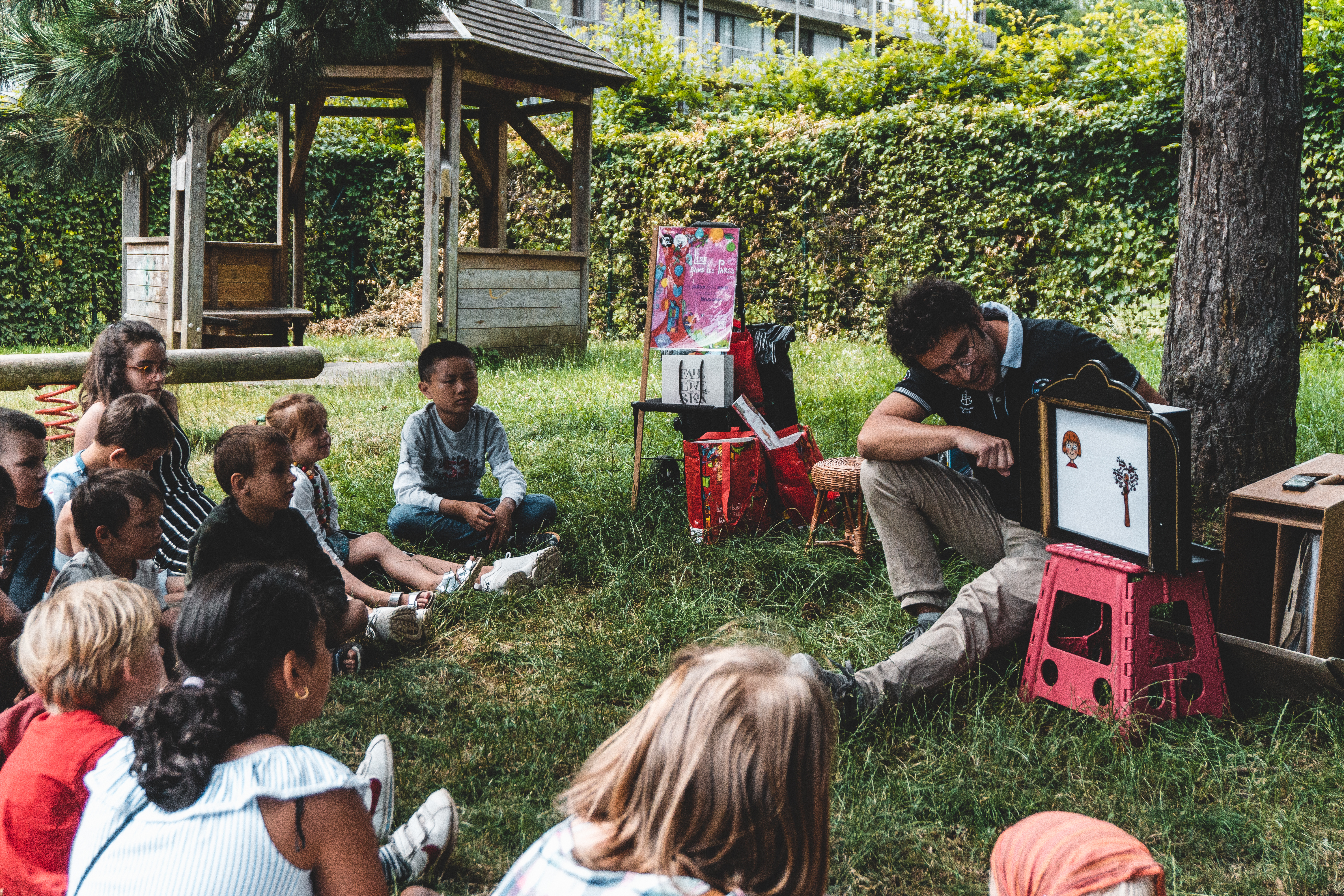 Cet été, les livres sortent des bibliothèques ! Un animateur et un bibliothécaire racontent des histoires chaque mardi à la plaine de jeux du Dries.