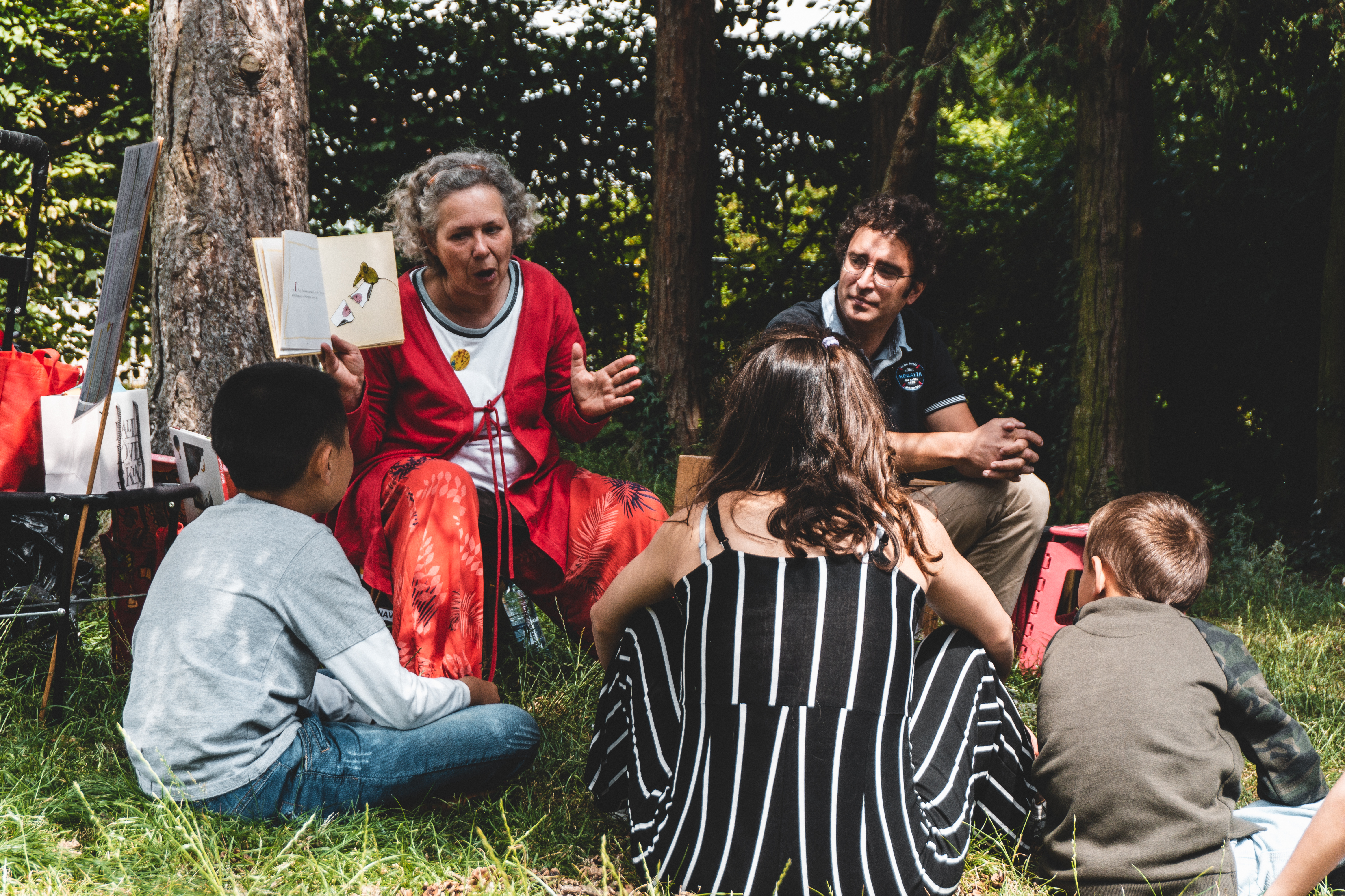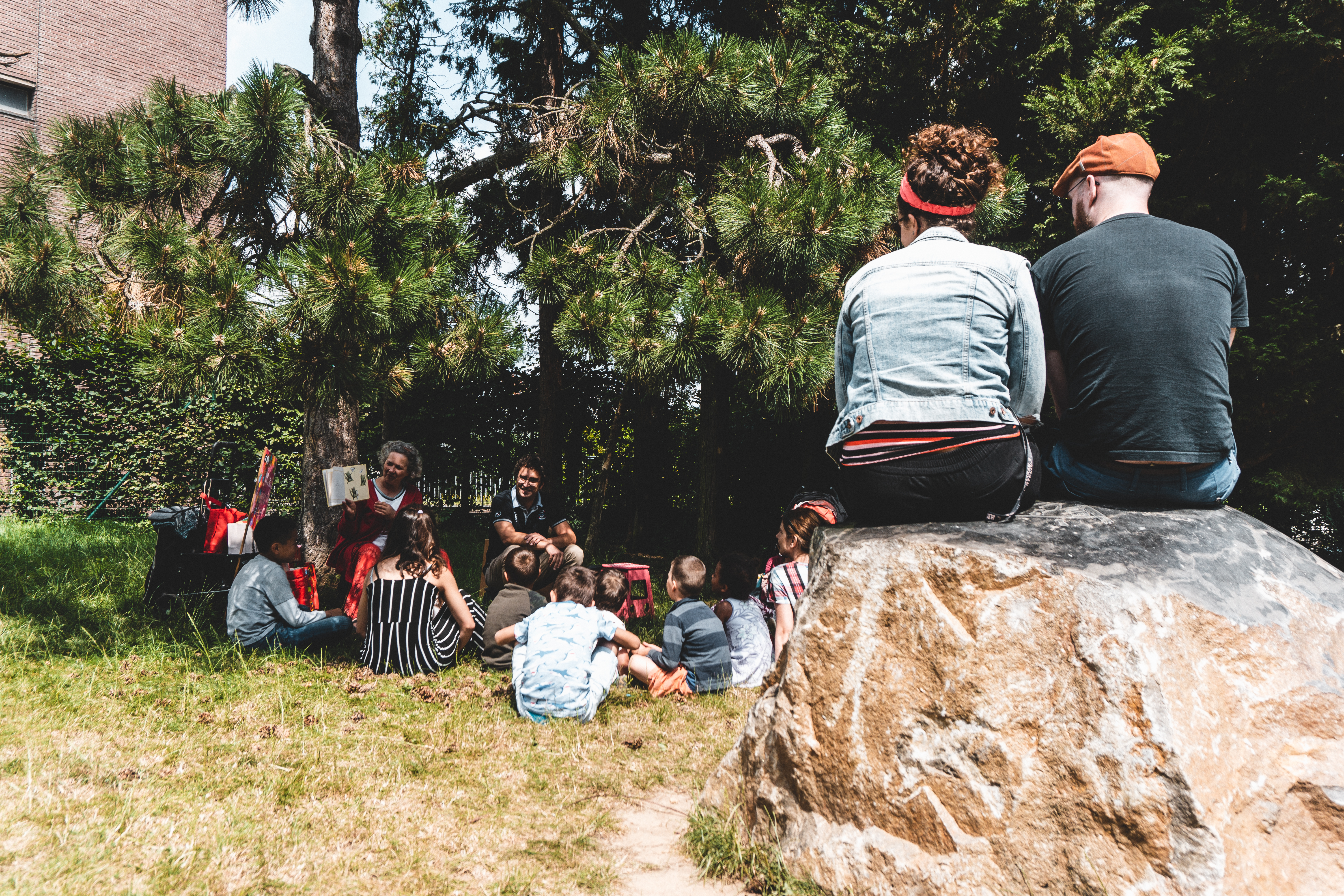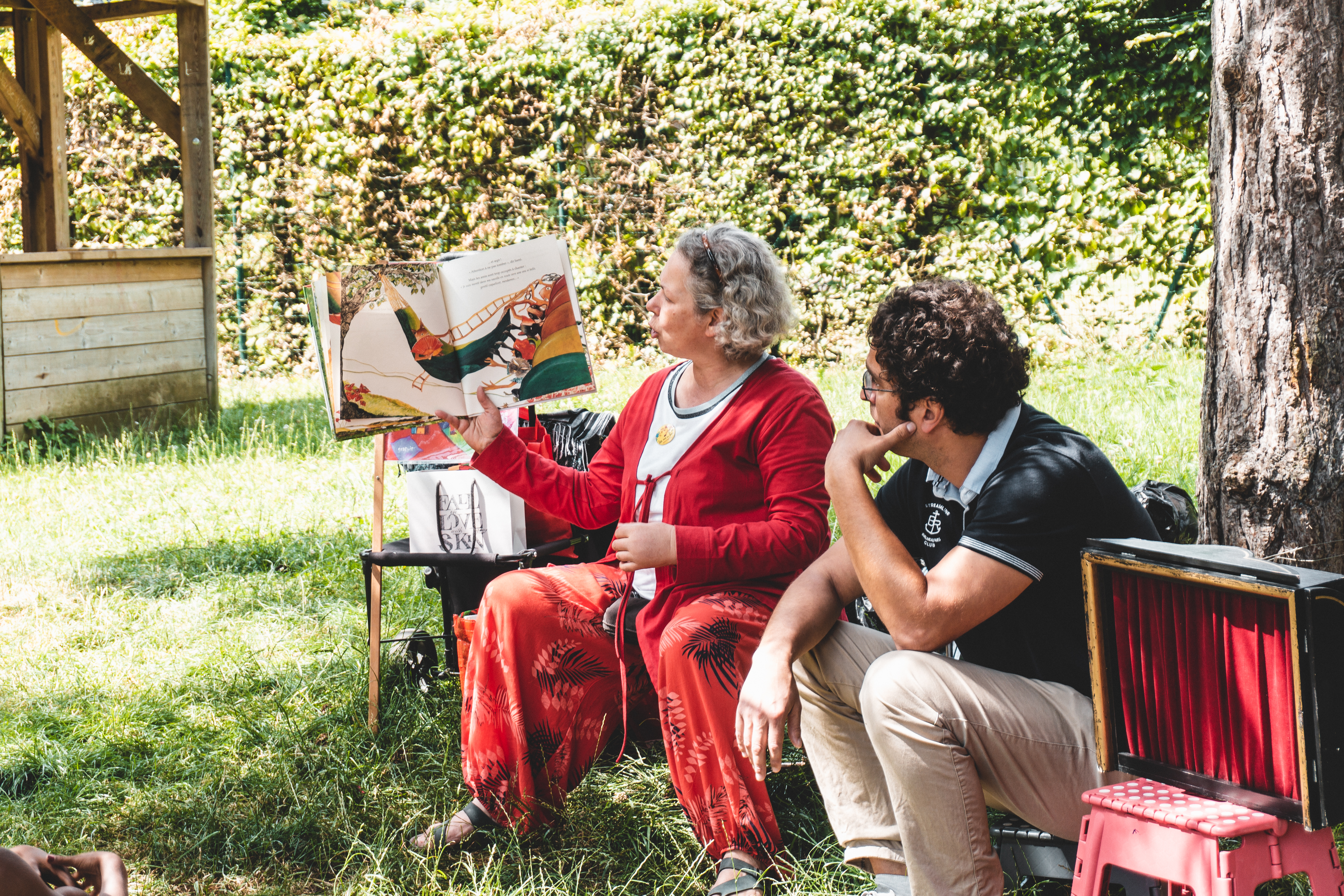 Cet été, les livres sortent des bibliothèques ! Un animateur et un bibliothécaire racontent des histoires chaque mardi à la plaine de jeux du Dries.