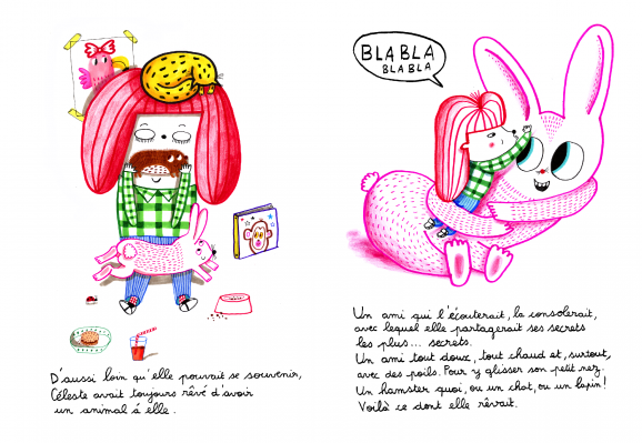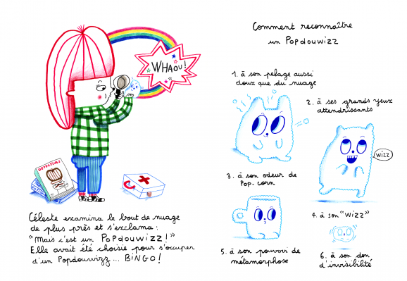 Que celui qui, enfant, n’a jamais harcelé ses parents pour avoir un animal de compagnie me jette la première pierre ! Céleste, notre héroïne, cheveux roses, pantalon rayé et pull à carreaux, n’y échappe pas : son désir le plus cher est d’avoir un animal rien qu’à elle. Un confident à quatre pattes, avec des poils, et des oreilles dans lesquelles déverser tous ses secrets. Par bonheur, elle trouve dans un petit coin de ciel une bête moutonnante, douce comme un nuage, qui la regarde avec de grands yeux : c’est un Popdouwizz !