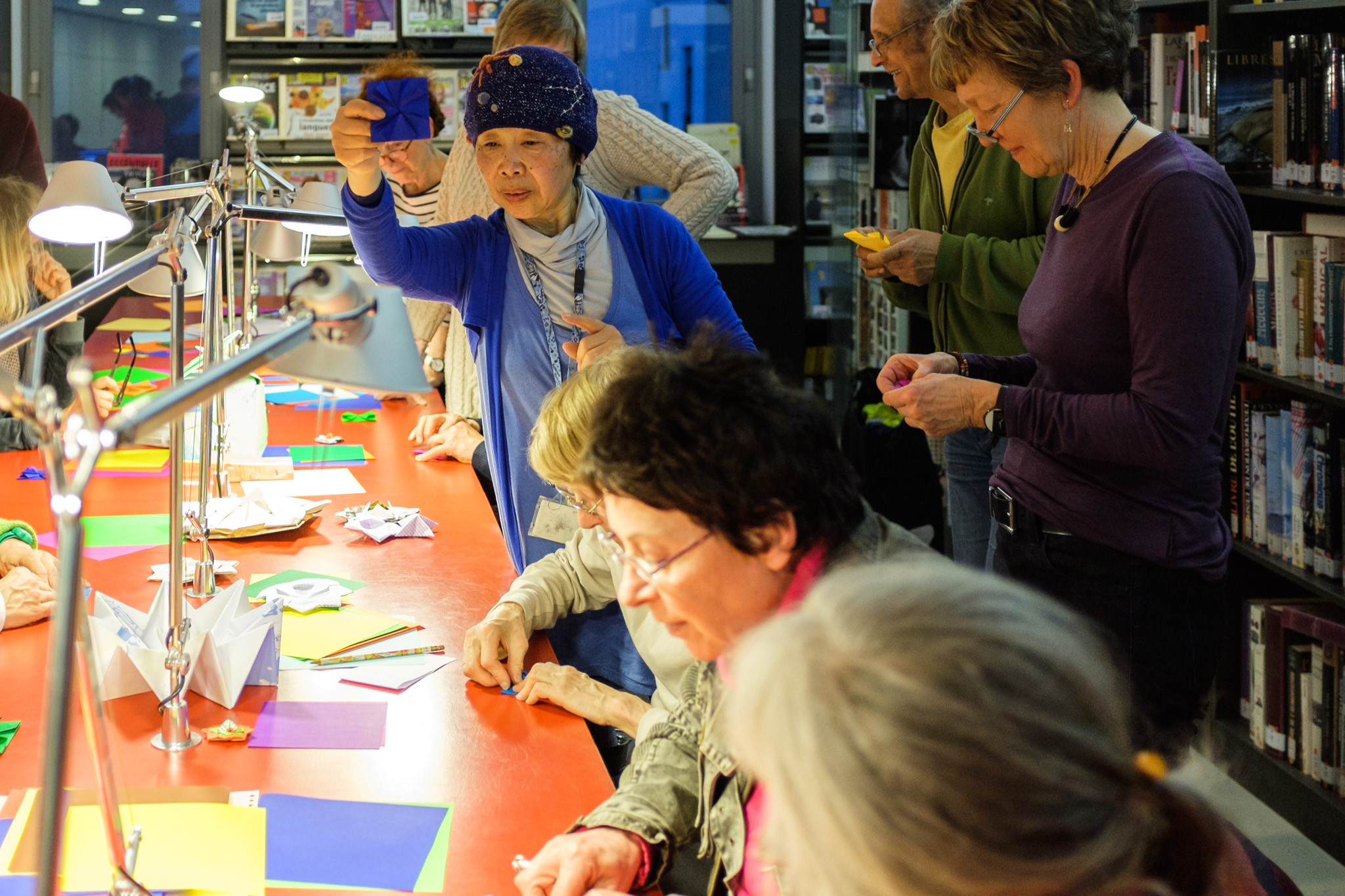 La soirée se partage entre démonstration par les artistes et un atelier de plis et découpes de papier.
