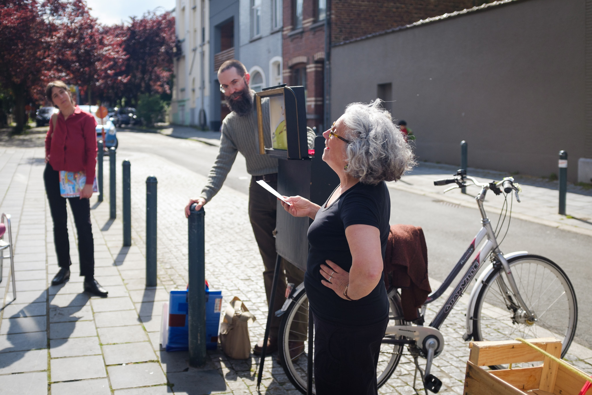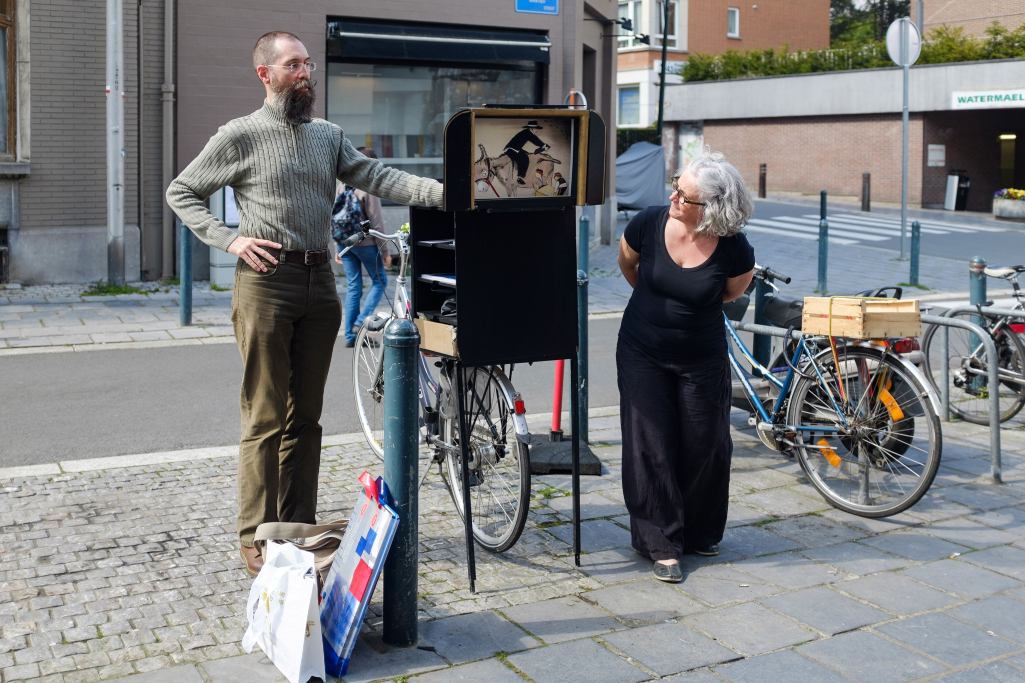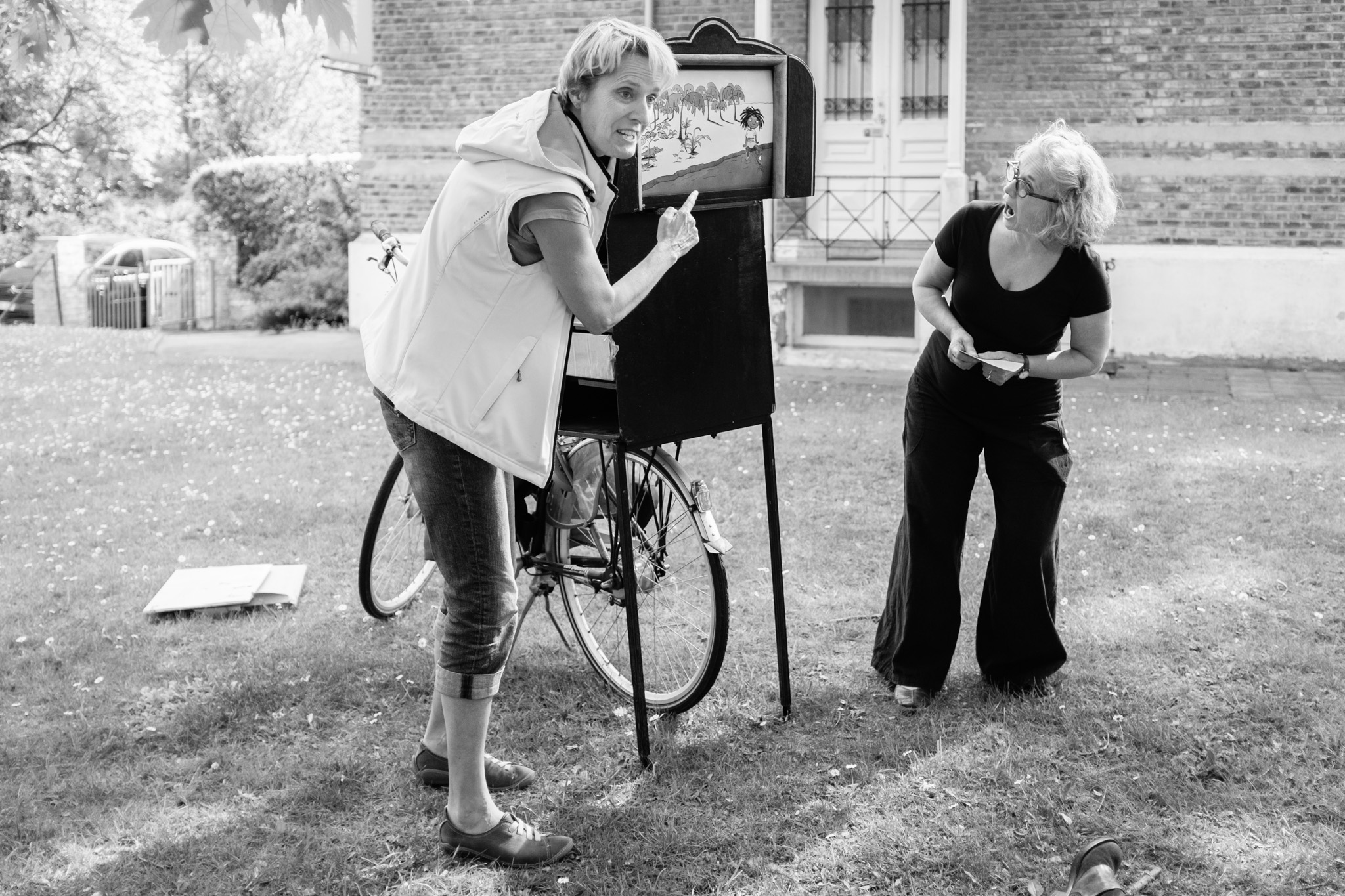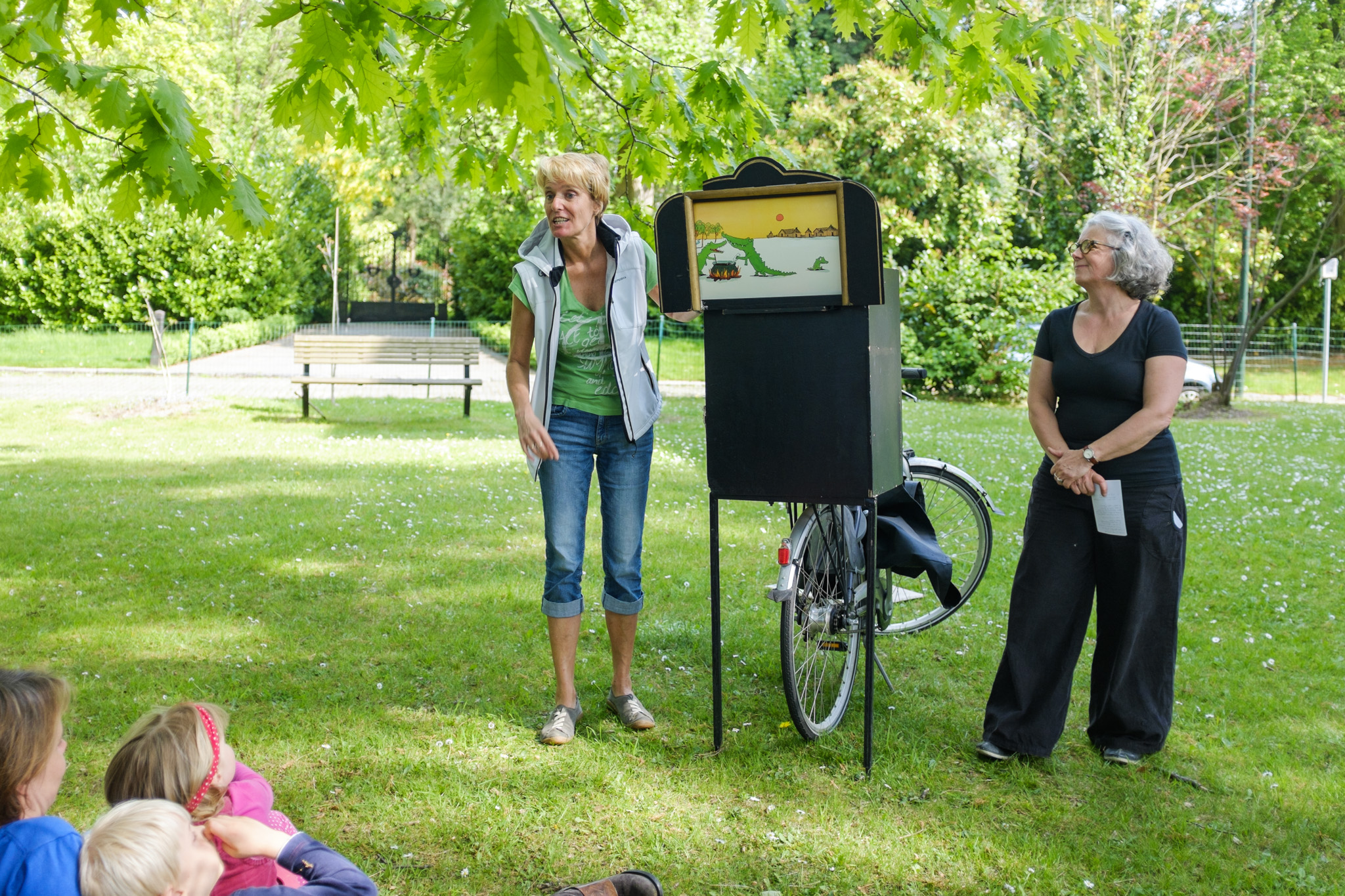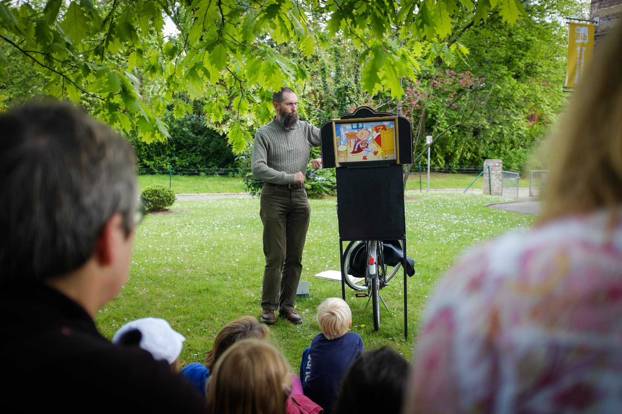 D’une bibliothèque à l’autre, les bibliothécaires racontent des histoires à l’aide d’un petit théâtre de papier accroché sur un vélo… une fois en français, une fois en néerlandais !