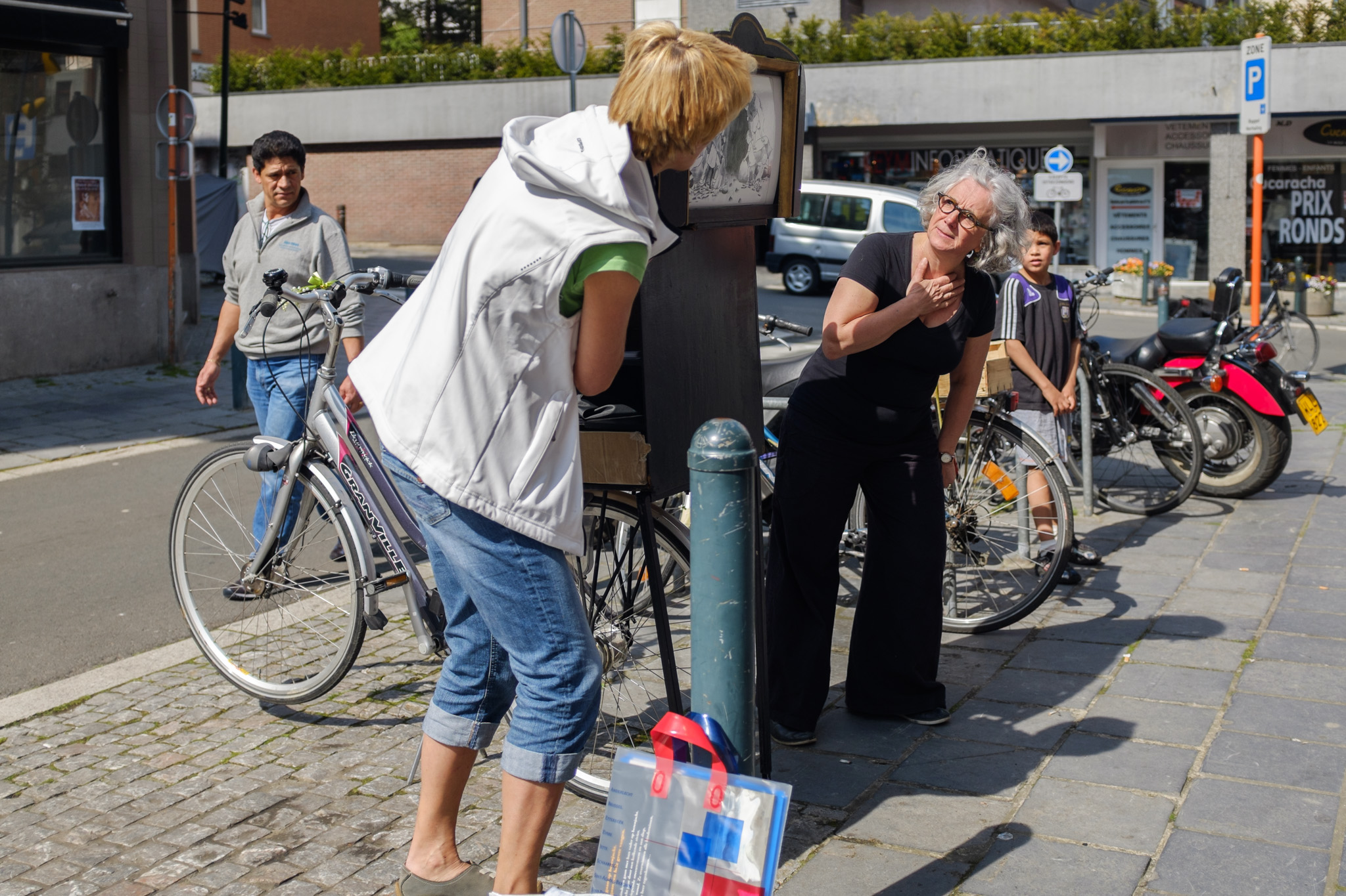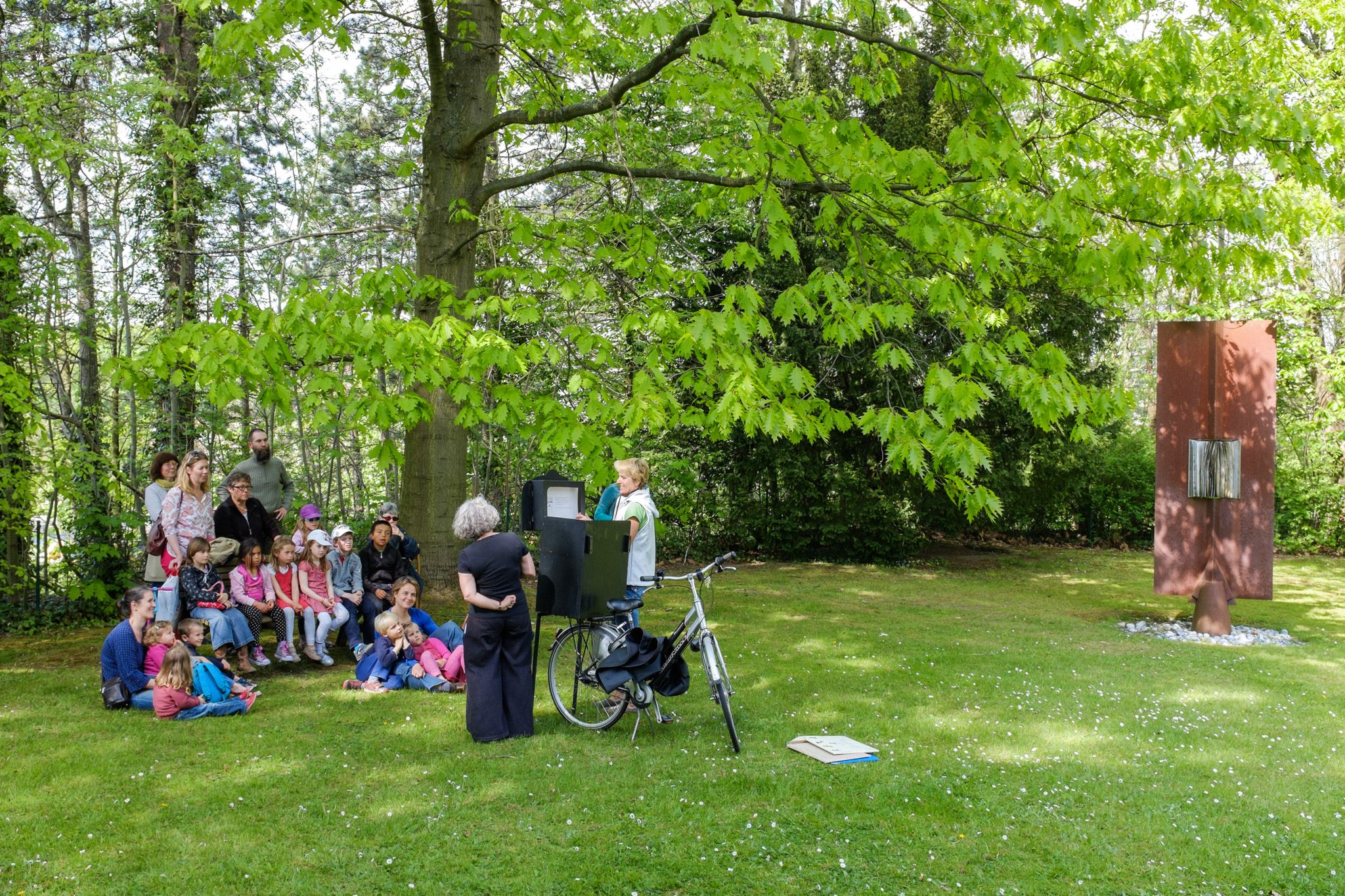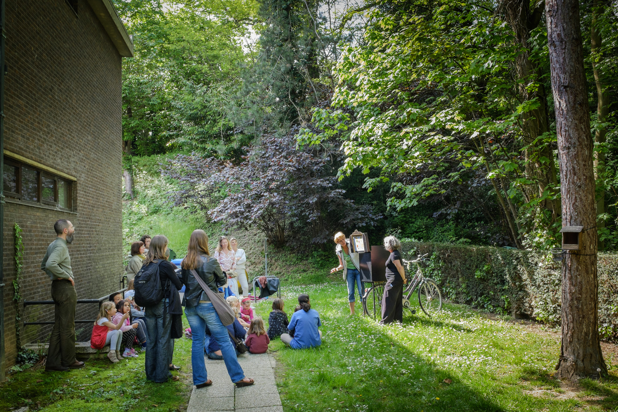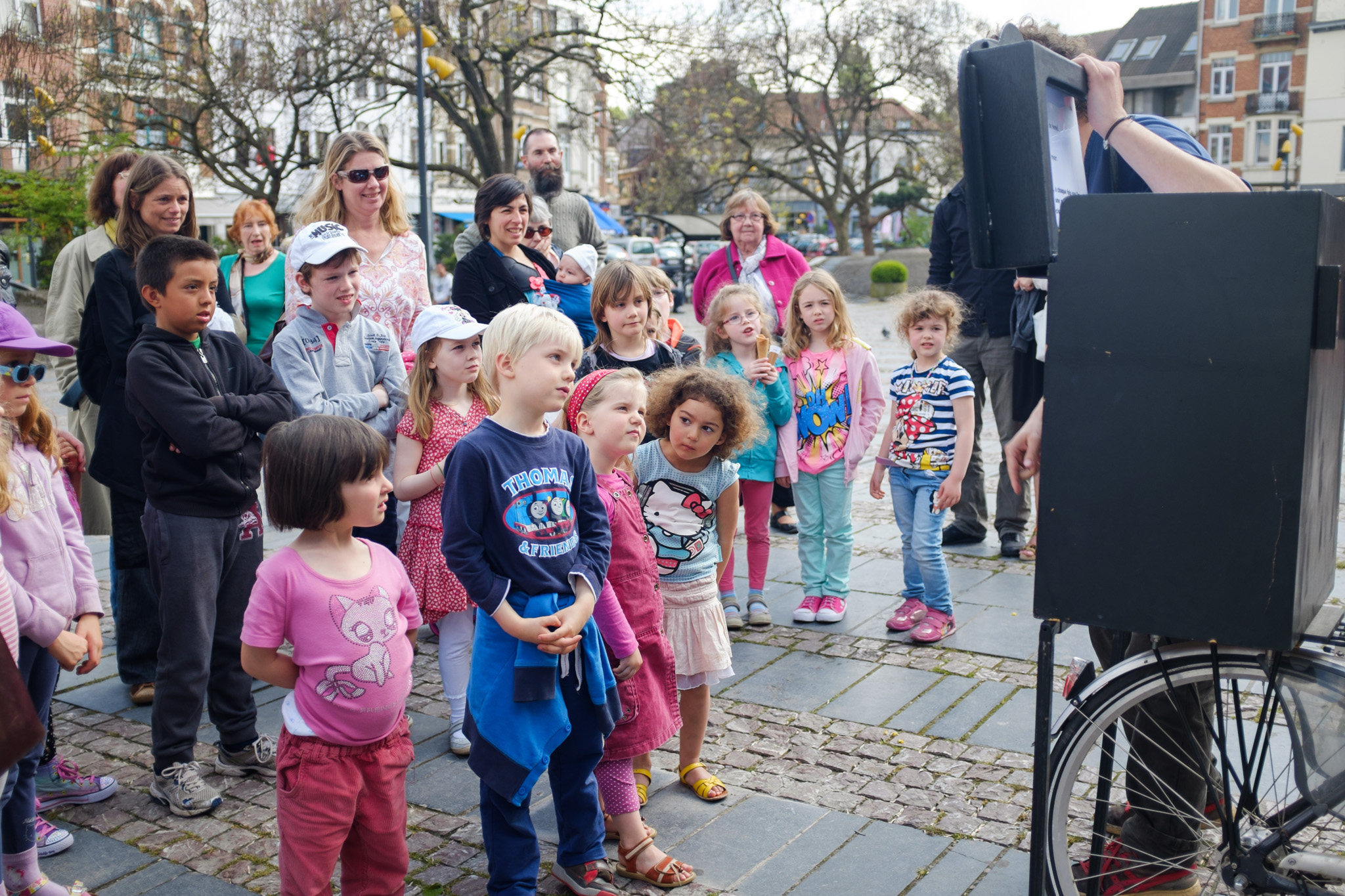 D’une bibliothèque à l’autre, les bibliothécaires racontent des histoires à l’aide d’un petit théâtre de papier accroché sur un vélo… une fois en français, une fois en néerlandais !