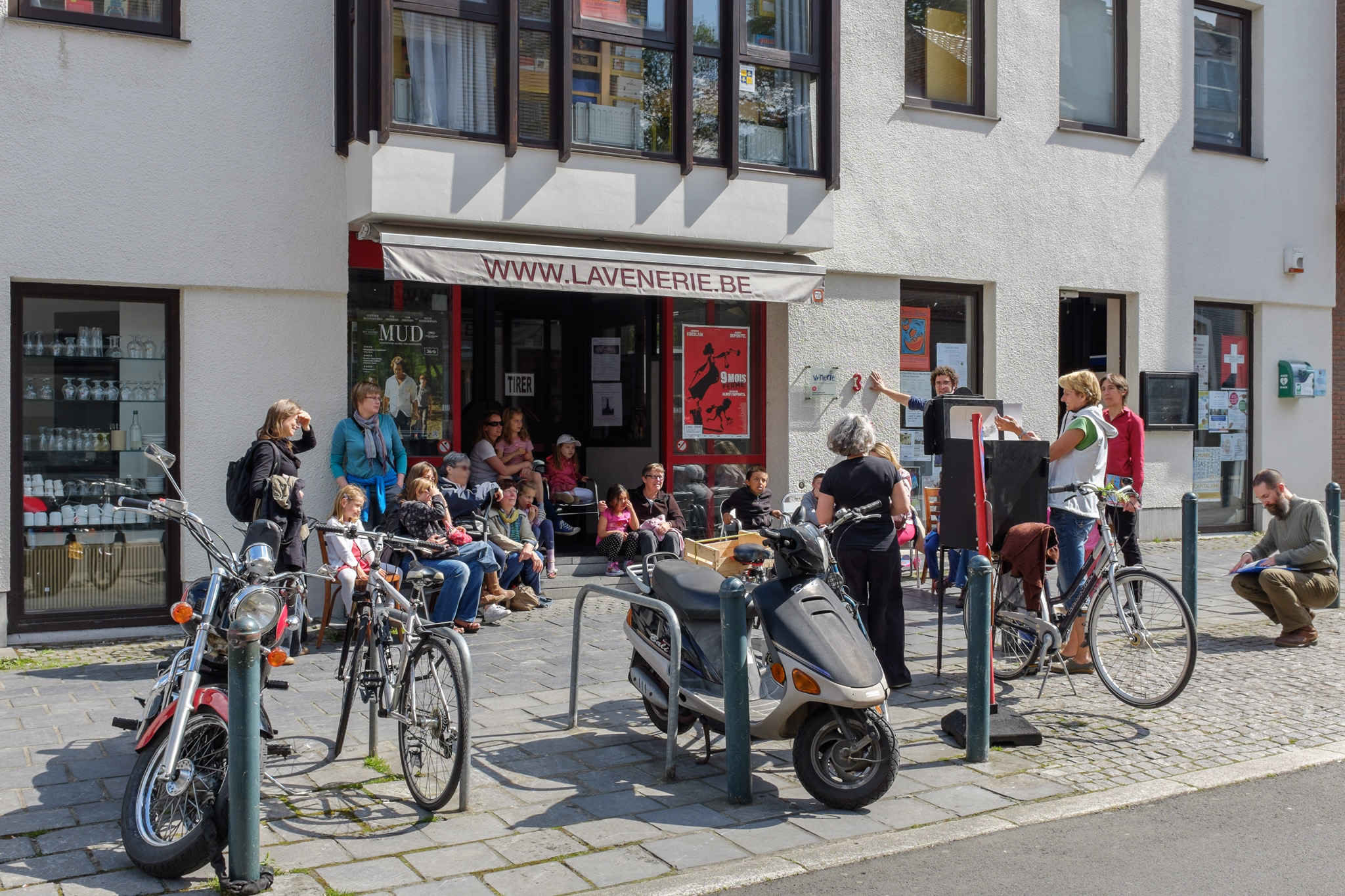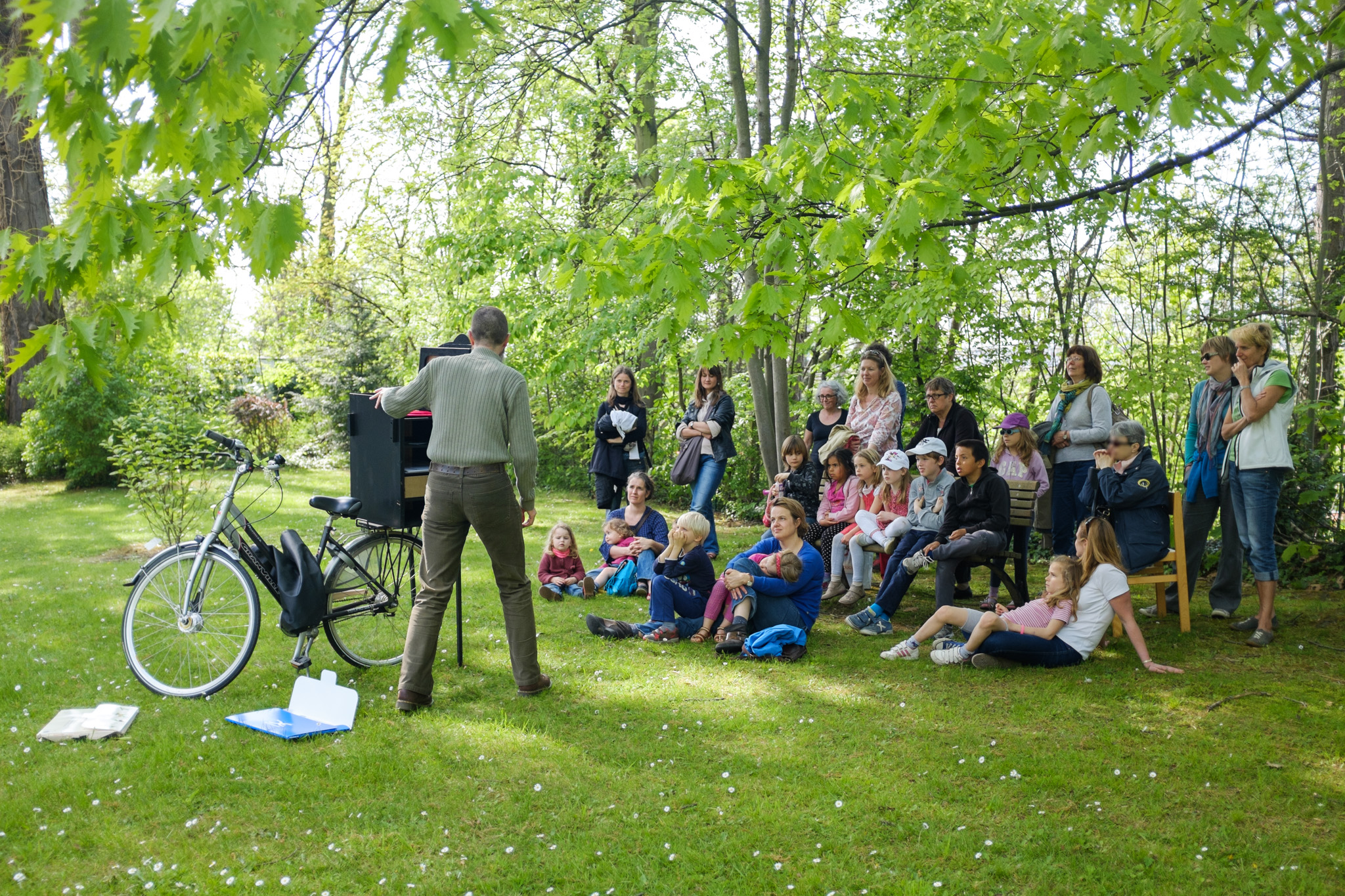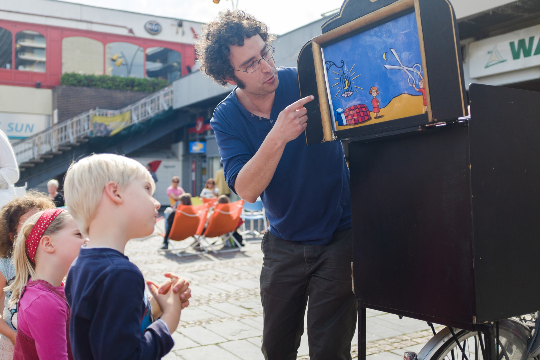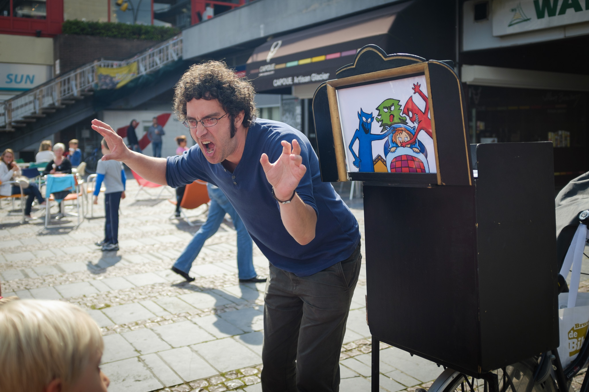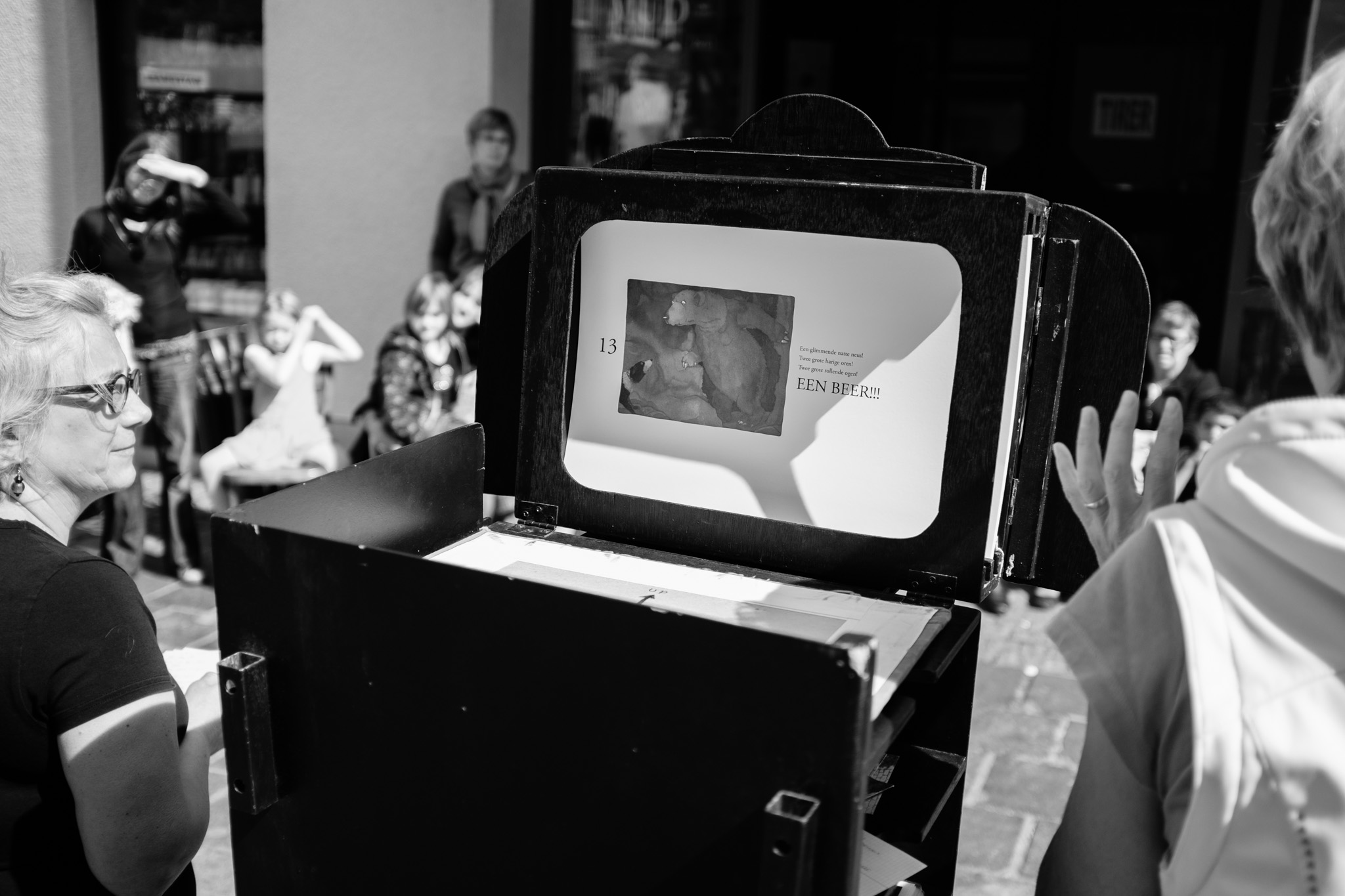 D’une bibliothèque à l’autre, les bibliothécaires racontent des histoires à l’aide d’un petit théâtre de papier accroché sur un vélo… une fois en français, une fois en néerlandais !
